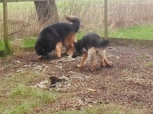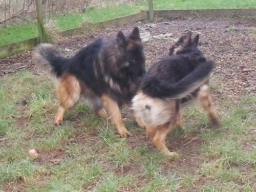 Hunden spielen. Zum Teil stellt sich die werdende Oma Enni auch vor Askia,